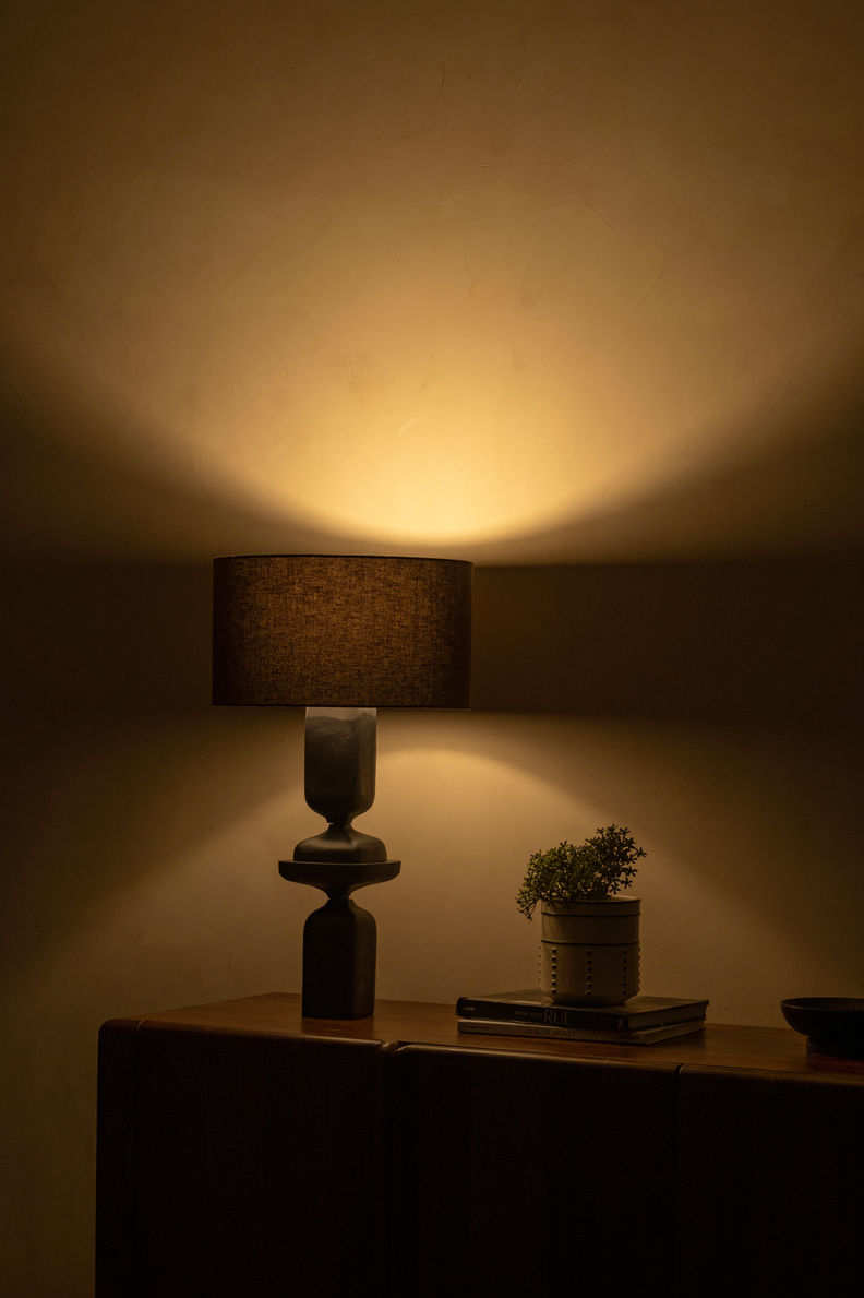 Karo by LumeHaus explores shadow as structure. The cast aluminium base carries softened mass, grounded yet restrained in silhouette. The dark fabric shade absorbs and tempers illumination, allowing light to remain close rather than expansive. The composition feels strong in outline, calm in effect. Karo anchors a space through presence rather than brightness, suited to interiors where atmosphere is shaped through shadow.